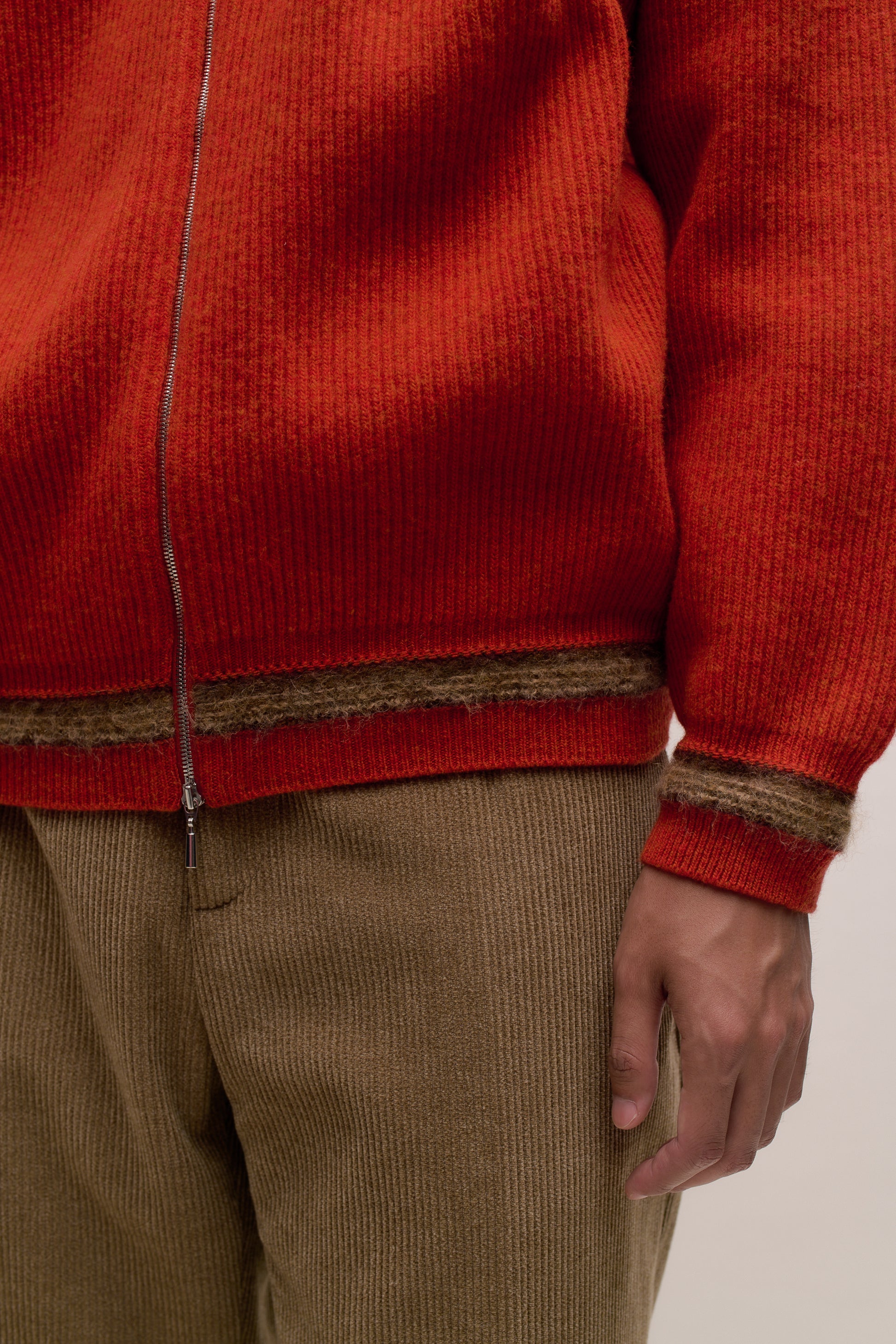 PRODUCT: This relaxed fitted cardigan features a two-way fron zipper, a simple spread collar, raglan sleeves and knitted contrasting details on the hem and cuffs.